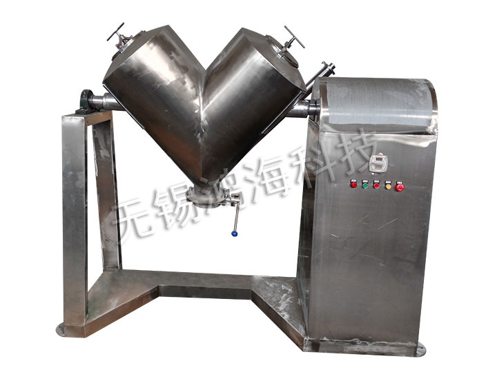 本設備吸取國內外同類產品的優點進行設計,利用混合機二圓柱筒長度不相等,形成不對稱,當混合機轉動時物料從分解到組合,從組合到分解,由于物料平面不同,也有橫向力,又推動物料進行橫向交流,每轉動一圈橫向力約使25%的物料從一個桶流向另一個桶,這樣物料橫向徑向混合,分解組合相互進行,使物料達到非常均勻的混合效果。