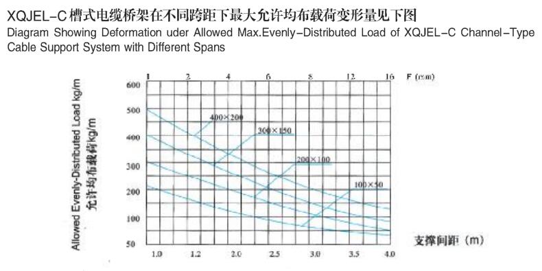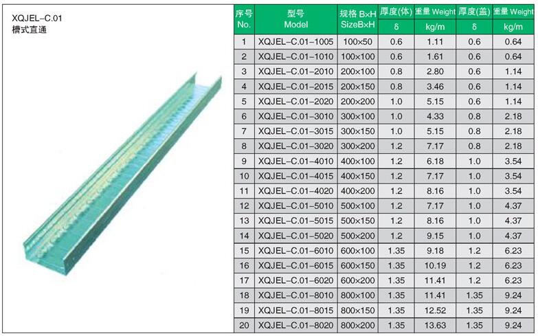 XQJEL_C.01槽式直通產(chǎn)品型號(hào)、規(guī)格、重量等參數(shù)及XQJEL_C槽式電纜橋架在不同跨距下允許均布載荷變形量。