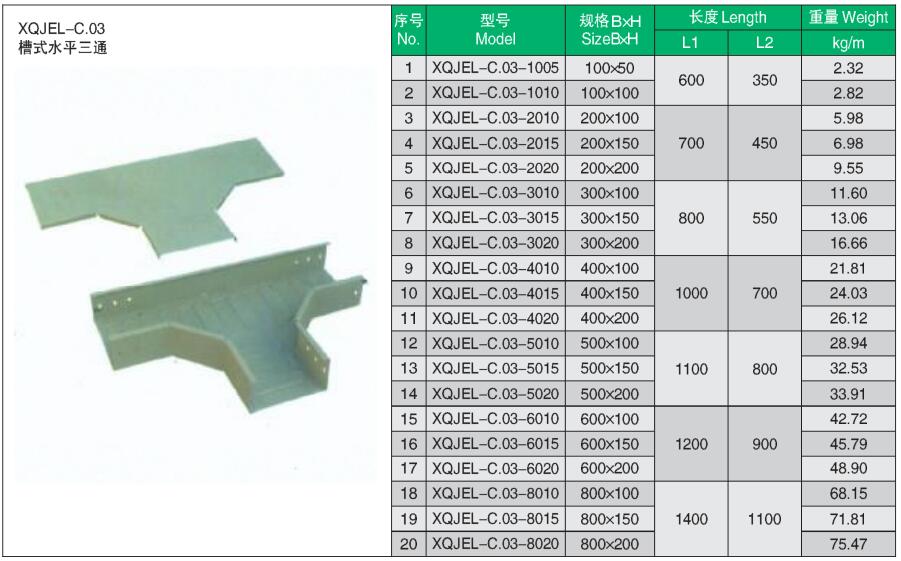 XQJEL_C.03槽式水平三通產品型號、規格、重量等參數及XQJEL_C槽式電纜橋架在不同跨距下允許均布載荷變形量。