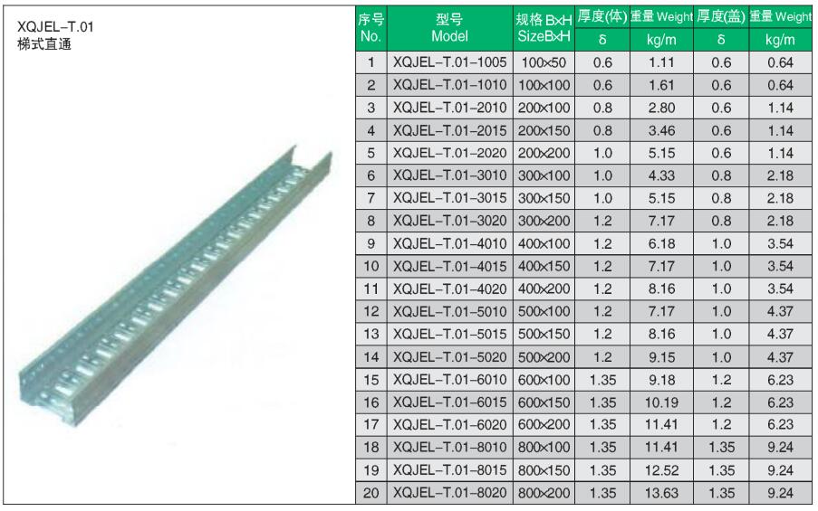 XQJEL_T.01梯式直通產品型號、規(guī)格、重量等參數及XQJEL_T梯式電纜橋架在不同跨距下允許均布載荷變形量。
