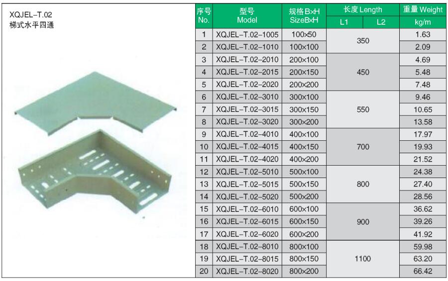XQJEL_T.02梯式彎通產(chǎn)品型號、規(guī)格、重量等參數(shù)及XQJEL_T梯式電纜橋架在不同跨距下允許均布載荷變形量。