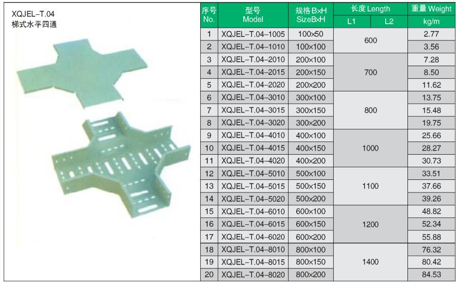 XQJEL_T.04梯式四通產(chǎn)品型號(hào)、規(guī)格、重量等參數(shù)及XQJEL_T梯式電纜橋架在不同跨距下允許均布載荷變形量。