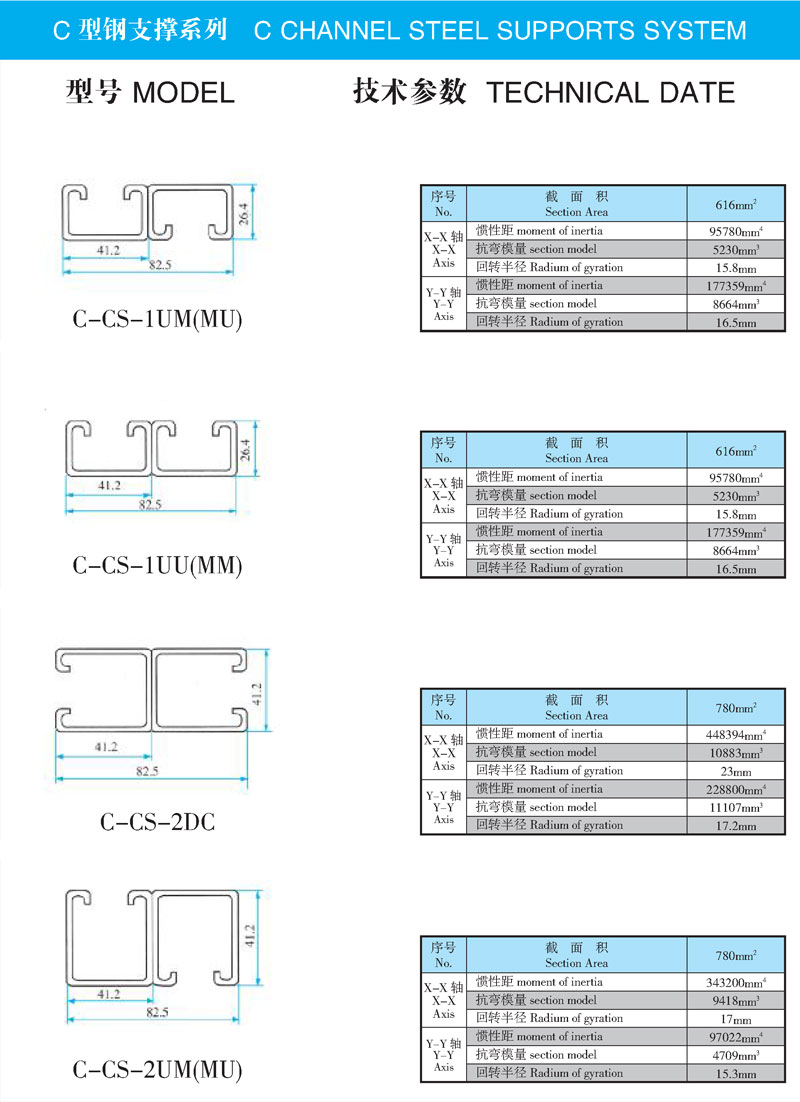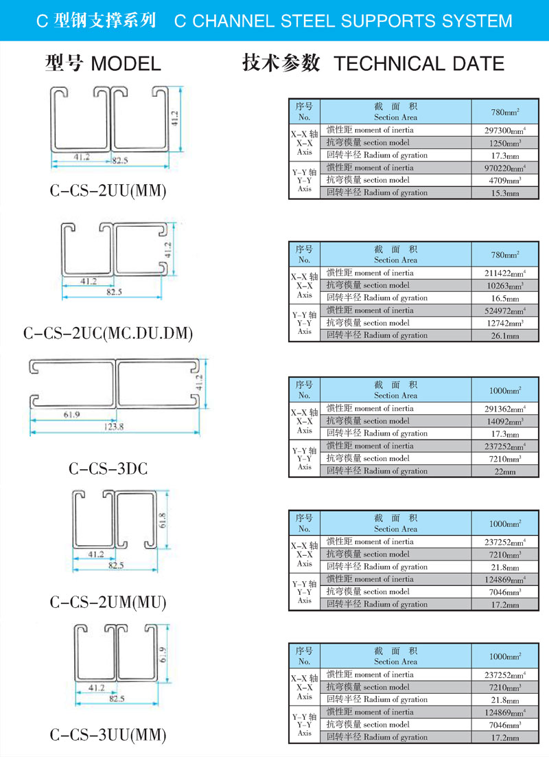 C型鋼支撐系列是我公司引進國外先進技術工藝,開發的產品。也是目前國際上廣泛應用的支撐件。具有結構合理、安裝靈括、強度可靠等優點?扇我庹{節支撐的高度及問距。適合于電纜橋架、通風管道等各種患掛、吊裝設備的安裝 。