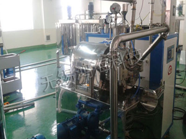 加料泵將預分散的材料送人研磨桶,研磨筒內裝有研磨介質,磨細后的物料經動態分離器排出,視產品細度不同,可采用單臺連續或多臺串聯連續研磨工藝。